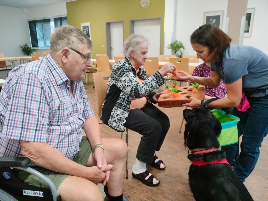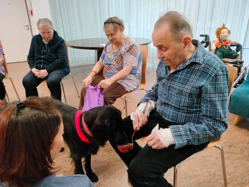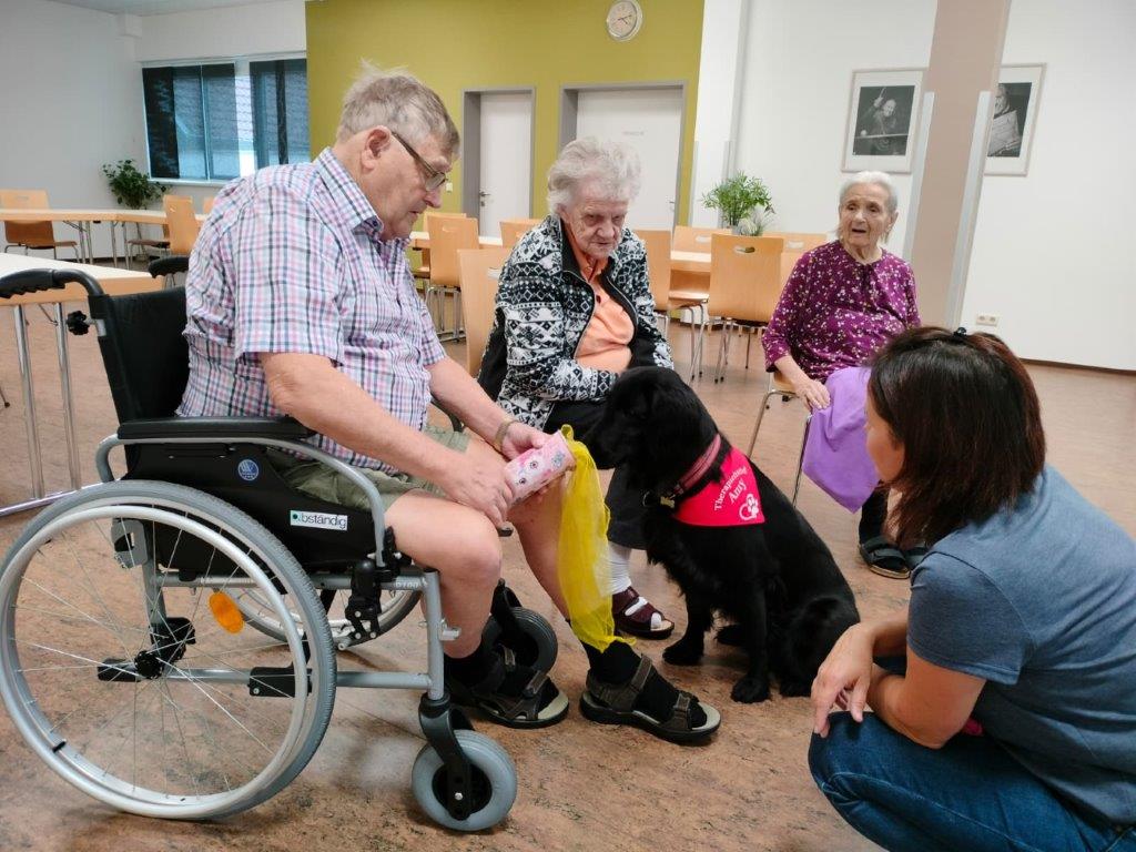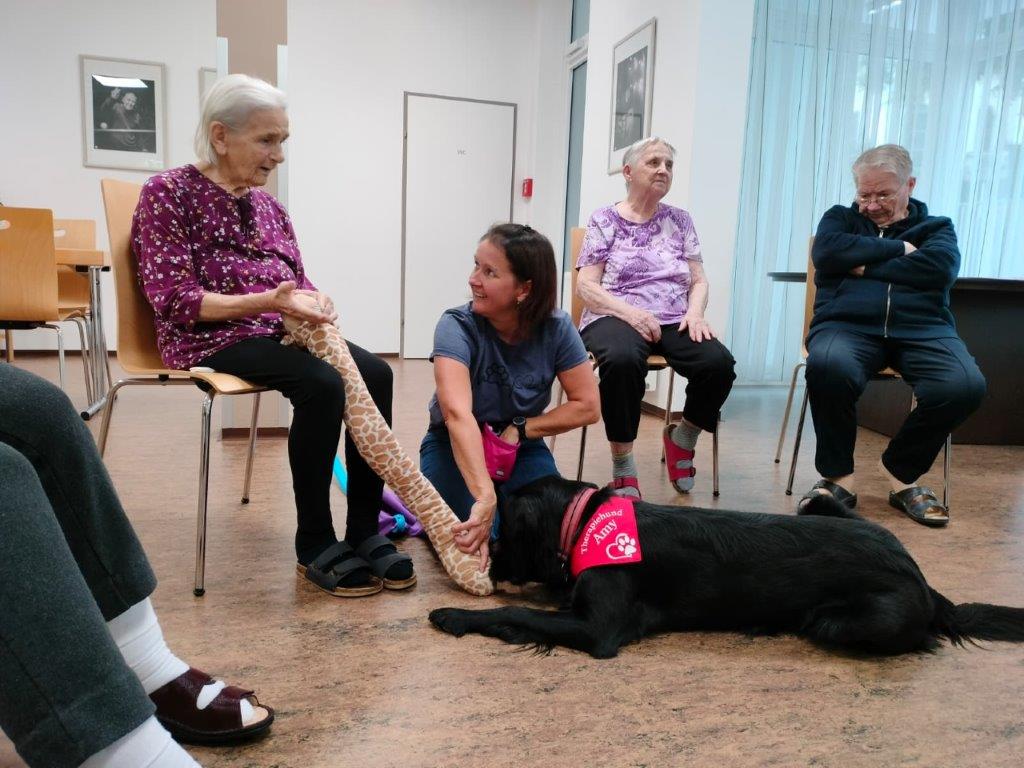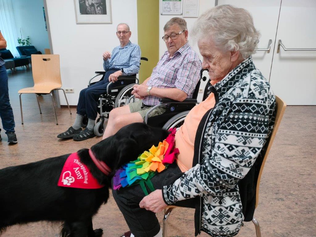 Am 25. September 2025 erhielten unsere Bewohnerinnen und Bewohner erneut Besuch von Frau Daniela Jagsch und ihrer Therapiebegleithündin Amy. Bei der Einheit kamen verschiedenste Materialien zum Einsatz mit denen unsere Bewohnerinnen und Bewohner mit der Hündin Amy in Kontakt treten konnten. Dadurch entstand ein wunderbares Miteinander von Mensch und Tier! Unsere Bewohnerinnen und Bewohner hatten große Freude an der gemeinsamen Zeit mit Hündin Amy.