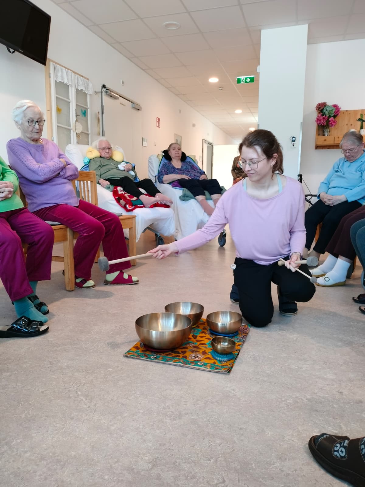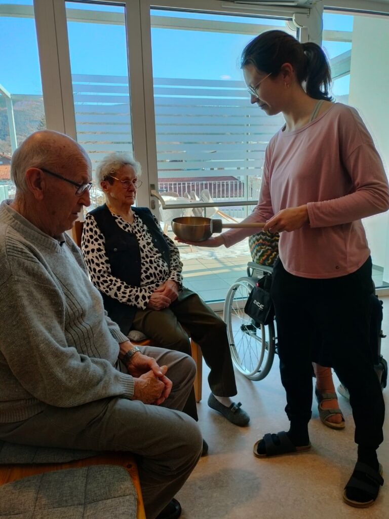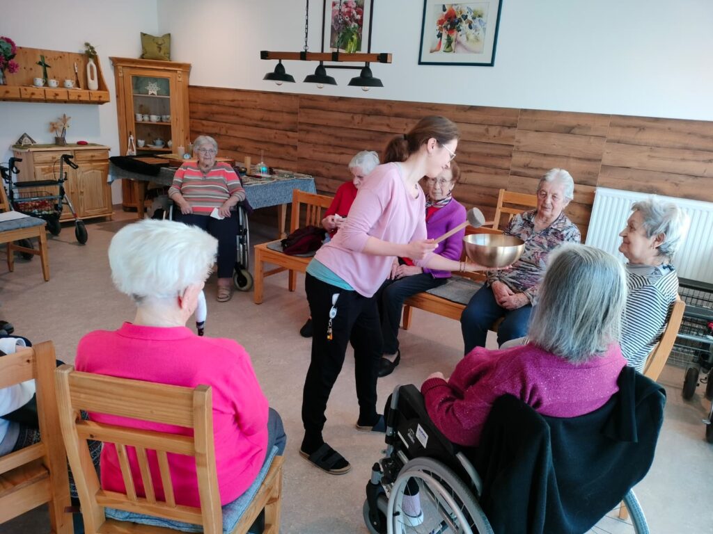 Am 19. Jänner 2026 war unsere Lebens- und Sozialberater-Praktikantin Frau Johanna Pöchtrager wieder bei uns im Pflegezentrum. Johanna ist sehr an der ganzheitlichen Gesundheit des Menschen interessiert – sie bietet unter anderem Yoga Kurse, Klangmassagen, Klangreisen und Health Coachings an. Dieses Mal wurden unsere Bewohnerinnen und Bewohner von Johanna dazu eingeladen, mit dem Einsatz von verschiedensten Klanginstrumenten, zur Ruhe zu kommen und sich fallen zu lassen. Es war sehr schön zu sehen, wie gut sie sich darauf einlassen konnten und wie sie die Klänge geerdet haben. Die Rückmeldungen unserer Bewohnerinnen und Bewohner zur Einheit mit Johanna fielen sehr positiv aus! Sie hatten große Freude an dem ihnen bisher Unbekannten – herzlichen Dank für den schönen Vormittag Johanna!