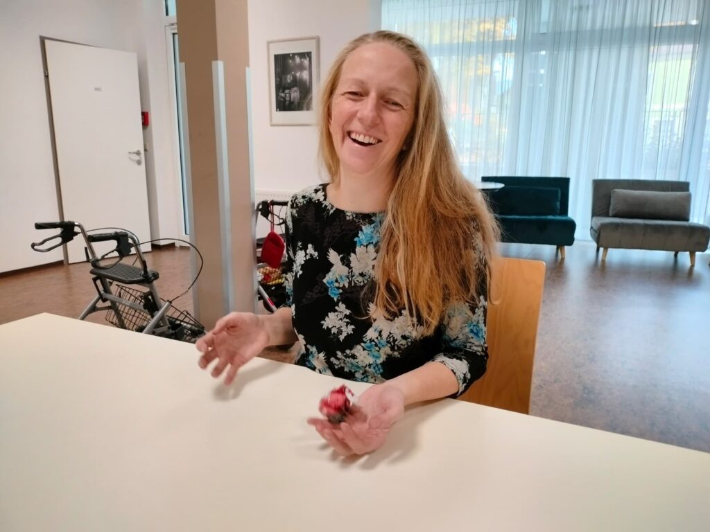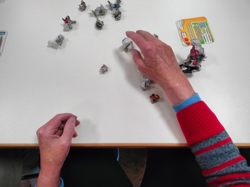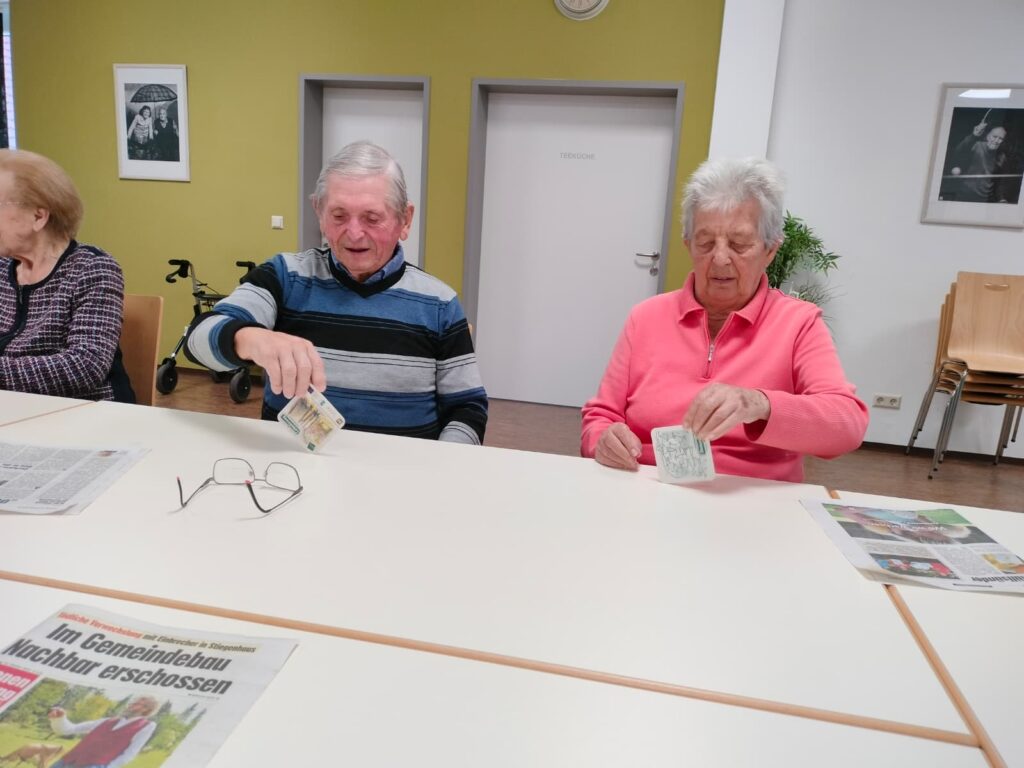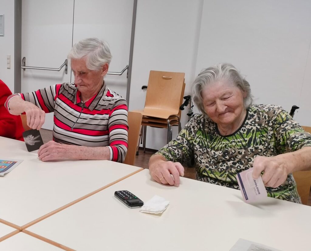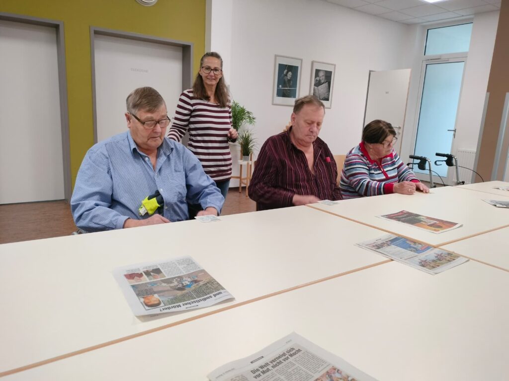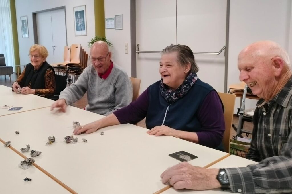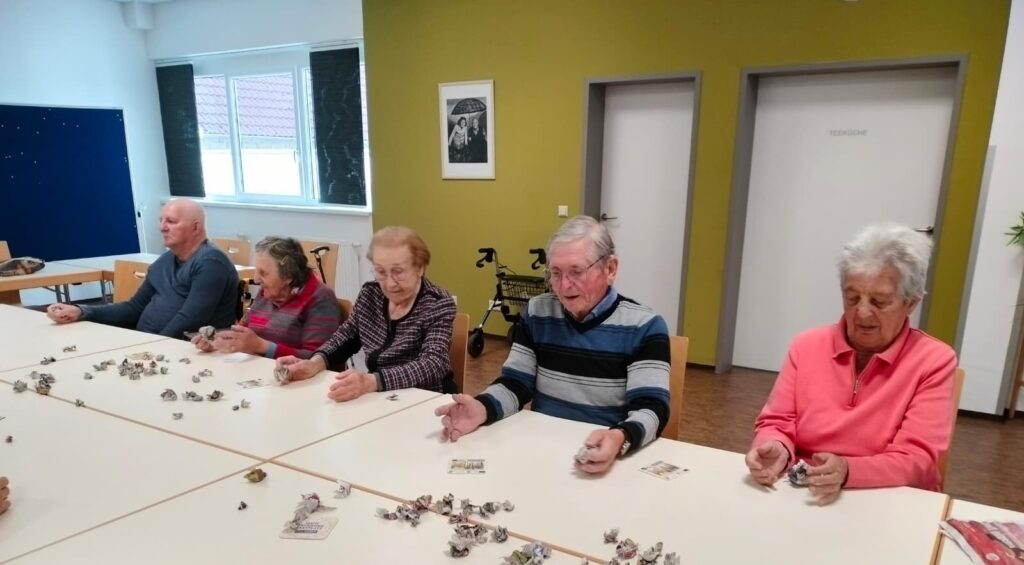 Am 20. Oktober 2025 fand die monatliche Einheit mit unserer Ergotherapeutin Frau Eva Schweng statt. Mithilfe von „Bierdeckeln“ und Zeitungspapier wurden mit unseren Bewohnerinnen und Bewohnern Übungen zur Schulung der Feinmotorik von Fingern und Händen durchgeführt. Es wurde beispielsweise der „Bierdeckel“ am Tisch mit den Fingern im Kreis bewegt, zwischen den Fingern in verschiedenen Varianten gedreht, das Zeitungspapier wurde gefaltet, in kleine Stücke zerrissen, zu großen und kleinen Kügelchen geformt,… Abschließend durften die Kügelchen dann auch mit einem Fingerschnips weggeschuppst werden – die Einheit war ein voller Erfolg!