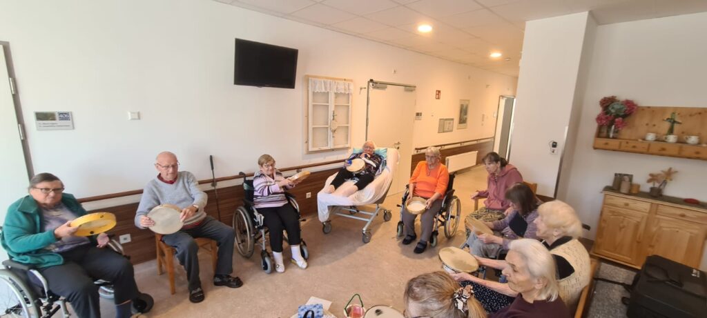 Der heilige Martin stand im Mittelpunkt unserer letzten Einheit von „Musik tut gut“. Dabei wurde die Geschichte des Mantel Teilens erzählt und bekannte Martinslieder gesungen. Die Trommelkünste der Bewohnerinnen und Bewohner wurden bei dem Lied „Ich geh mit meiner Laterne“ unter Beweis gestellt. Zum Abschluss wurden bekannte Volkslieder gesungen, die am Flügelhorn begleitet wurden.