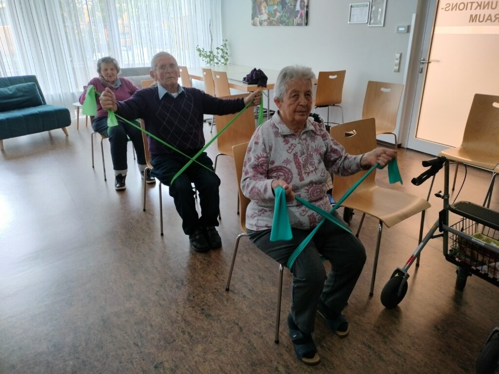 Am 26. Mai 2025 fanden zwei weitere Einheiten zum Thema Sturzvorbeugung/Sturzprävention statt. Unsere Ergotherapeutin Frau Eva Schweng plante die Einheiten und setzte diese dann mit Hilfe von Frau Leonie (Praktikantin), Frau Lisa Naderer (Seniorenbetreuerin), Frau Elisabeth Waxenegger und Frau Theresia Taubenschmid (Ehrenamt) in die Tat um. Die Einheit setzte sich aus Sitzgymnastik, unter anderem mit dem Theraband und „Yoga auf dem Stuhl“ zusammen. Die Bewohnerinnen und Bewohner konnten die vorgezeigten Übungen mit Unterstützung sehr gut umsetzen und ließen sich auch gut auf die Übungen aus dem Yoga Training, was für alle neu war, ein.